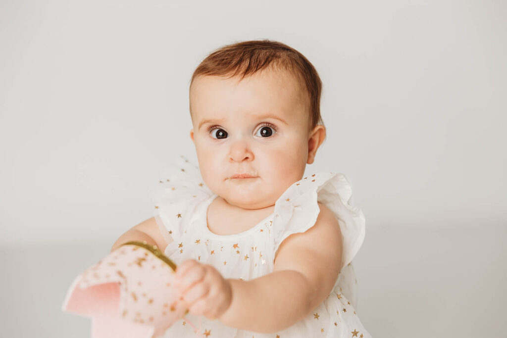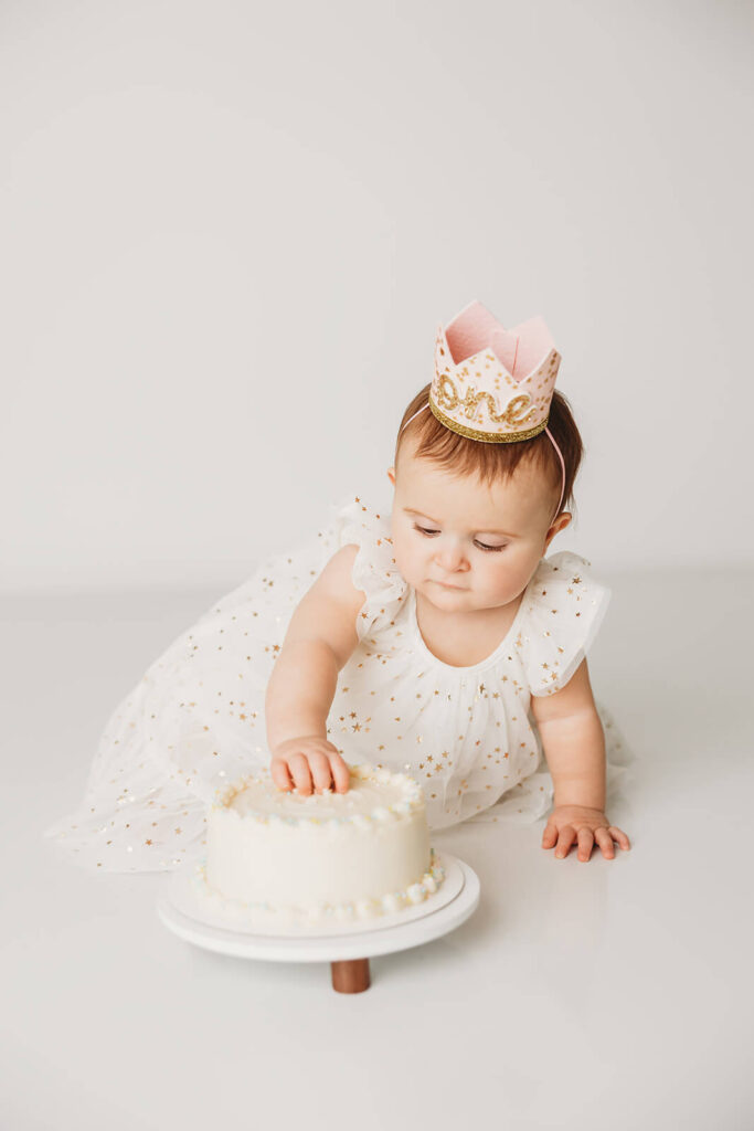 After that, we moved into her simple cake smash setup. I kept everything clean and minimal on a white backdrop to let the true star shine. Simple cake smashes are some of my most requested setups for a reason. They’re classic, they photograph beautifully, and they allow your baby’s personality to take center stage. Stella sat down, looked around quietly for a moment, and then began exploring everything at her own pace.