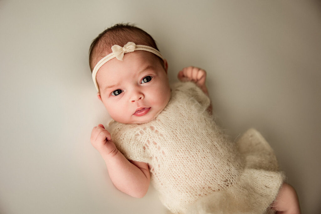Soft tones like cream, oatmeal, white, taupe, and dusty pastels photograph beautifully. They keep the focus on your baby’s sweet features—not bright colors or graphic prints.